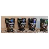 | 4 - Hand Painted Blue Carnival Glass Tumblers - Enamel Painted Leaves and Berries - Tumblers Measure 4 1/4" Tall |