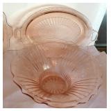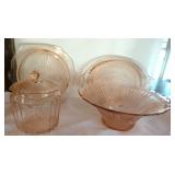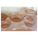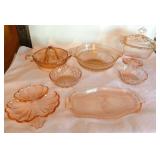 | 7 Pieces of Pink Depression Glass - Open Lace Candy Dish, Juicer, Heisey Dish, Floral Dish, 2 Diamond Bowls, and 8 1/2" Double Handled Bowl with Some Chipping on One Handle |