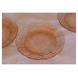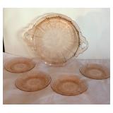 | Pink Depression "Cherry Blossom" Cake Set - 10 1/4" Double Handled Cake Plate and 4 - 6" Dessert Plates |