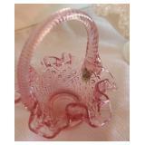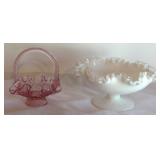 | Fenton Pink Glass Basket and Silvercrest Ruffled Edge Compote - Signed Fenton Basket is 3 3/4" Across - Compote is 8" |