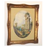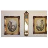 | Vintage Mirror and Frame Set - Pair of Gold Framed Roman Scenes and Gold Framed Narrow Rectangular Mirror - Prints Measure 22" By 18" |