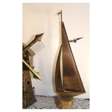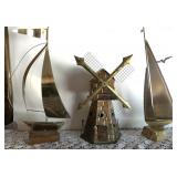 | Mid Century Brass Lot including 2 Handmade Sailboat Statues and Sank Yo Japan Windmill Music Box - Windmill is 12" Tall Including Spoke - Tallest Sailboat is 14" |