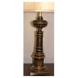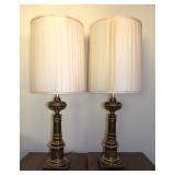 | Pair of Great Mid Century / Vintage Corinthian Column Style Table Lamps - Gold Tone with Nice Shades - Lamps Measure 25" to Bulb |