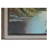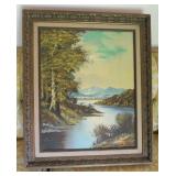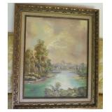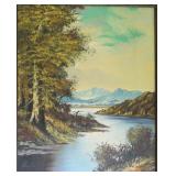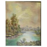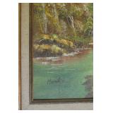 | Original Hand Painted Oil Painting of Water Scene with Mountains in Background - Signed Hunter - Framed in Gold Gilt Frame - Frame Measures 25" By 21" |