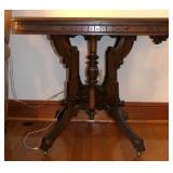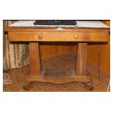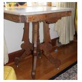| Walnut Victorian Marble Top Table - White Marble Top - Burl Accent on Apron - Table Measures 28 1/2" Tall 28 1/2" By 19" - Small Chip Bottom Edge of Marble |