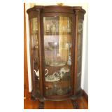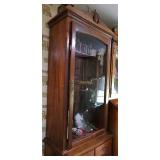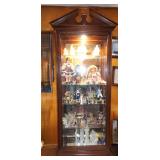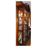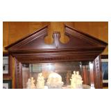 | Mahogany Finish Lighted Display Cabinet - Broken Arch Pediment - Dentil Molding - Roman Key Details Front and Top Moldings Beveled Glass Front- 2 Glass Doors on Each Side - Mirrored Back - Cabinet Measures 87" Tall 36" by 16" |