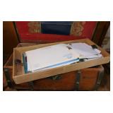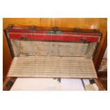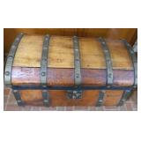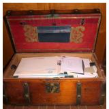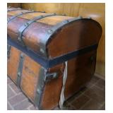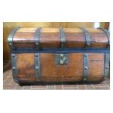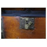 | Very Nice 19th Century Wood Stage Coach Trunk with Brass Bands - Original Lock and Key, Tray, and Top Divider - Measures 16" Tall 26" by 15" - Missing Handles on Ends - NO CONTENTS |