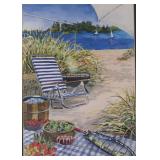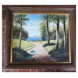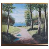 | Original Oil on Canvas Painting of Path Leading to Sailboats on Water - Framed - Frame is 22" by 25" |
