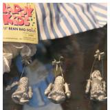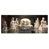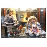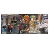 | Shelf Lot Including 2 Porcelain Dolls, Pewter Clowns, British Soldiers, and Miniature Department 56 Snow Babies |