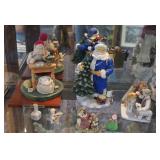 | Shelf Lot including Person High Santa, Tar Heels "Gameday Santa" Porcelain Figures, Norman Rockwell, Miniature Linden Clock, Etc. |