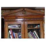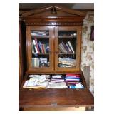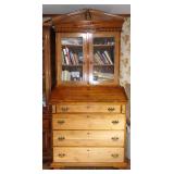 | Walnut Book Case Secretary by Person County, NC Cabinet Maker E.J. Harris -Broken Arch Pediment with Tear Drop Finial - Glass Doors, Fixed Wood Shelves, Drop Front Desk Top With Divided Interior - Locking Drawers and Doors - Smaller Top Drawers Over 3 Larger Drawers - Bracket Feet - Solid Ends - Cabinet Measures 92 1/2" Tall 42" By 24 - NO CONTENTS |