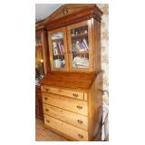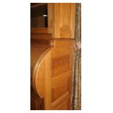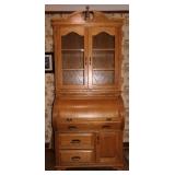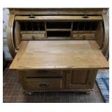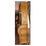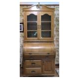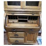 | Contemporary Oak "C" Roll - Bookcase Secretary Desk - Broken Arch Pediment - Book / Display Case Top with Arched Glass Doors - Adjustable Shelves - "C" Roll Top Desk with Divided Compartments Inside - Slide Out Writing Surface Over 3 Drawers and Cabinet with 2 Adjustable Shelves - Raised Pannel Sides and Door Fronts - Locks with Key - Measures 89" Tall 36" By 21" |