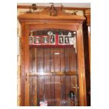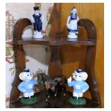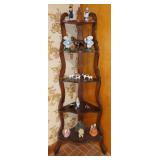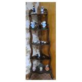 | Handmade Mahogany Finish Corner What Not Shelf WITH Contents - 5 Shelves - Wavy Shelf Fronts - Measures 45" Tall - All Contents Included - UNC Salt & Pepper Shakers, Cows, Goats, Swan, and Other Animal Figures |