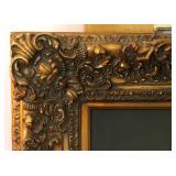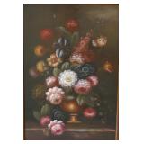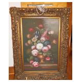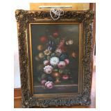 | Large Urn of Flowers Print on Board in Elaborate Ornate Gold Frame with Attached Art Light - Frame Measures 49" By 37" |