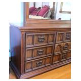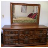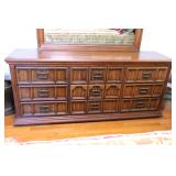 | 1970's Plastic / Faux Wood Dresser with Mirror - "Pecan" Finish - 9 Drawers - Dresser Base Measures 31" Tall 74" by 19" |