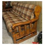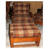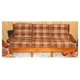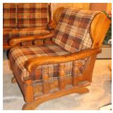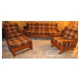 | 1970's Pine Sofa, Platform Rocker, and Chair with Ottoman - Orange and Brown Tweed Upholstery |