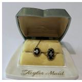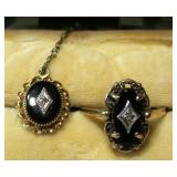 | 10kt Yellow Gold Ring with Oval Black Onyx Stone - Diamond Accent in Center and Gold Filled Black Onyx Pendant with Diamond Accent - Both in Taylor Maid Jewelry Box - Ring Size 6 1/2 - Weighs 3.1 Grams |