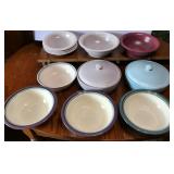 | 12 Pieces of Pfatlzgraff - "Terrace Lilac" Bowls, Vegetable Bowl, and 2 Covered Dishes / Covered Vegetable - Lilac and Light Blue, Burgundy 9" Vegetable Bowl and 3 Vegetable Bowls with Striped Rims |
