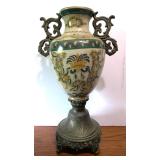 | Pretty Decorator Urn / Mantle Vase - Antiqued Metal Fittings- Ceramic Body with Crackel Finish - Floral Sprays and Ribbons - Vase Measures 16 1/2" Tall |