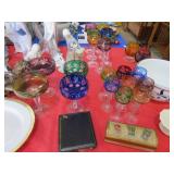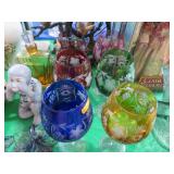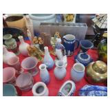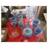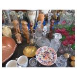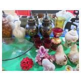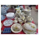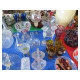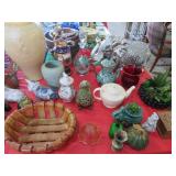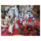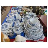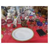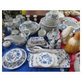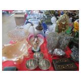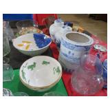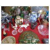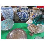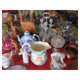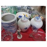 CHINA & GLASS: Wedgwood Jasperware in light & dark blue, green & rose; Large set of Blue Onion with unusual pieces; Lladro statues; Lenox; Royal Doulton; Cabbage leaf bowl; Oriental mud man; Basket of flowers; Ceramic candlesticks; Bird figures; Gold rim tray; Blue & white teapot; Large lidded urn; Decorated ovoid shape on base; Small blue & white vase; Decorative plates; Delft; Hummels; Teapots; Studio pottery; Lots of trinket boxes; Pfaltzgraff dinnerware set with yellow flowers; Oriental plates, vases & bowls; Gold rim bowls decorated with green foo dogs; Ginger jars; Capodimonte flowers; Holly tidbit server; Steins; Colored cut to clear goblets in multiple sizes; Beautiful cobalt bulbous vase with silver overlay; Triple decanters in holder; Crystal bowl over silver warmer; Waterford; Ruby & crystal condiment set in holder; Lots of crystal decanters; Red & green goblets set; Candlesticks; Carnival glass bowl; Champagne flutes; Individual salts in box; Corning ware casseroles; Yellow Pyrex bowl; Crystal pitcher; Swan; Art glass; Cruets; Cake plate; Stein; Ice bucket; Enameled glass vases; Perfume; Knife rest; Crystal bowls; Bell; Biscuit jar; Baskets; Butter dish and more!