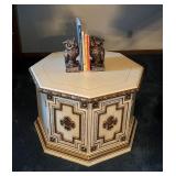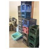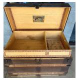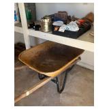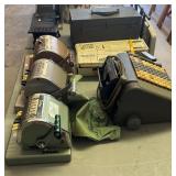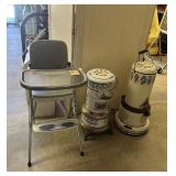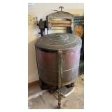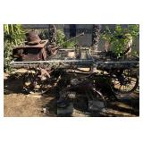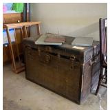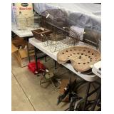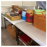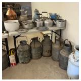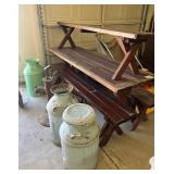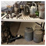 old kerosene heaters, milk cans, picnic table & benches, 2 old trunks,