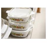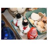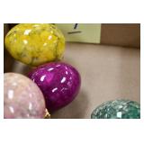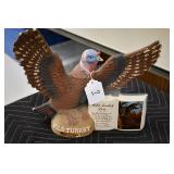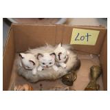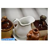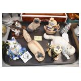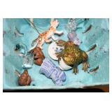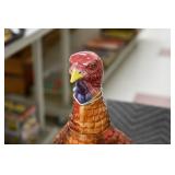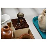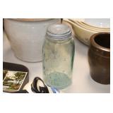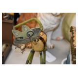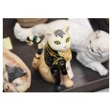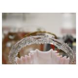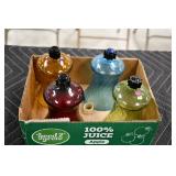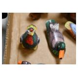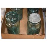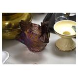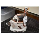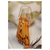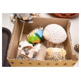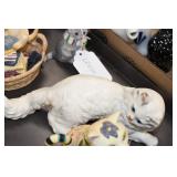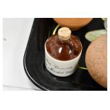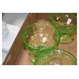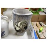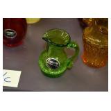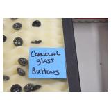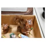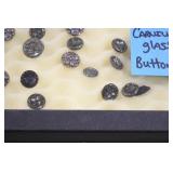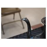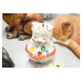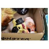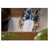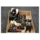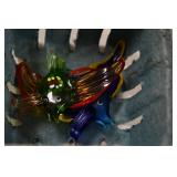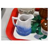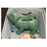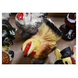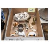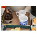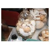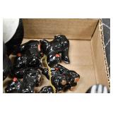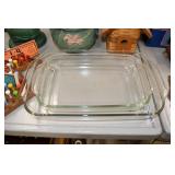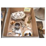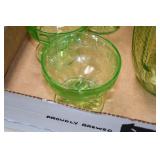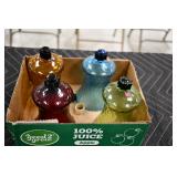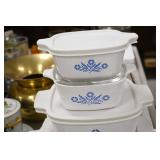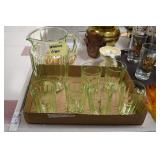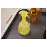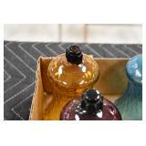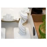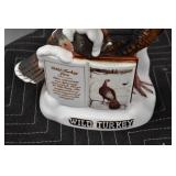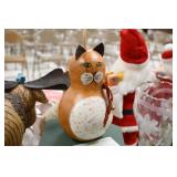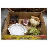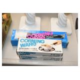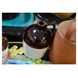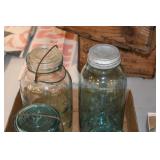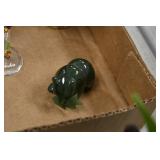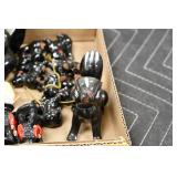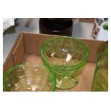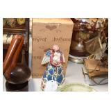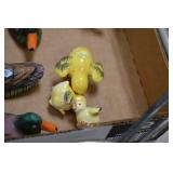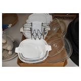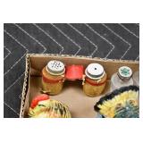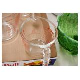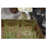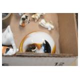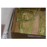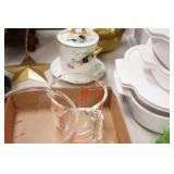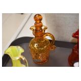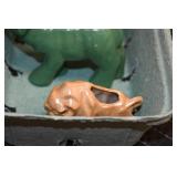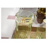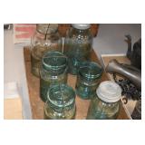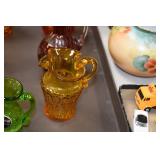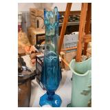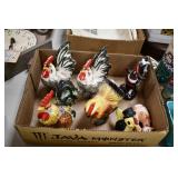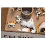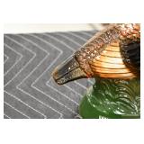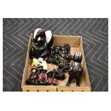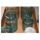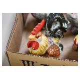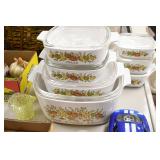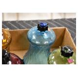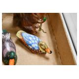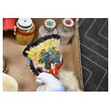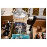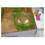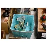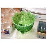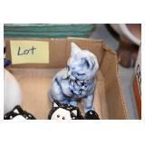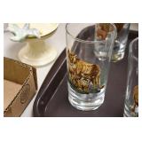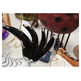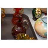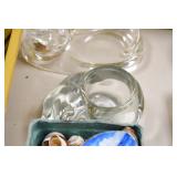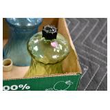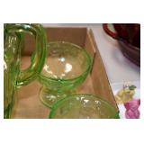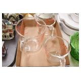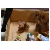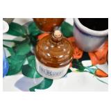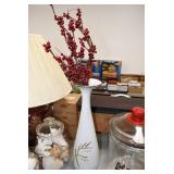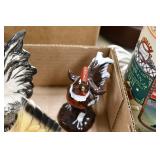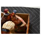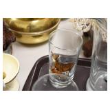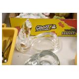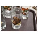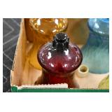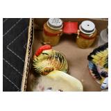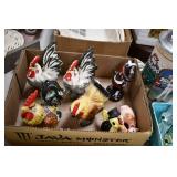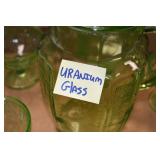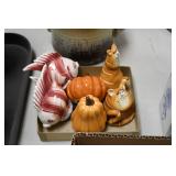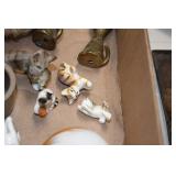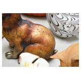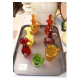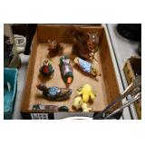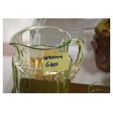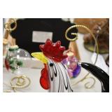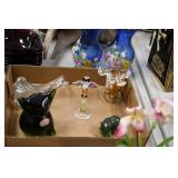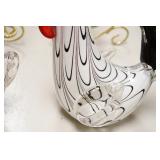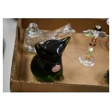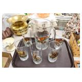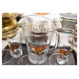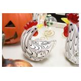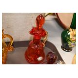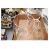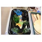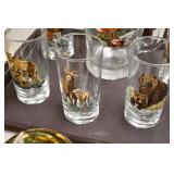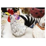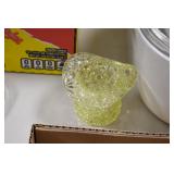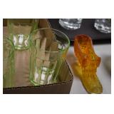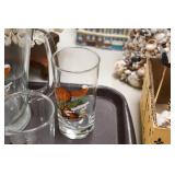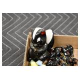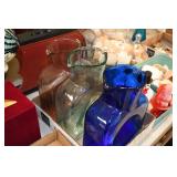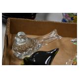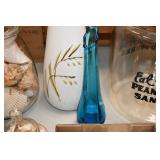 Antique Glassware: Wild Turkey and Other Decanters, Carnival Glass Buttons, Art Glass Chickens, Wildlife Pitcher and Water Glass Set, Uranium Glass, Corning Kitchenware, Pyrex, Vintage Cat Glass Figures, Decorative Glass Vases, Milk Glass, Blue Ball Jars, and Other