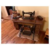 Furniture · Framed items · 1775 Congress picture · Robert Summers print—WINTER LACE—Limited Ed. 26/500 · Platform rocker · Victorian gentleman’s chair · Victorian library table · End tables · 6 ft. x 9 ft. panda rug · 8 ft. 2 in. x 11 ft. 2 in. area rug · Framed mirrors · Panda-themed lamps · Rustic wooden table with 4-legged stool · Oak sideboard buffet · Singer treadle sewing machine with accessories · Wagon wheel table