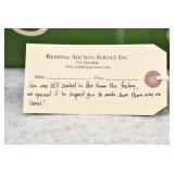 Redding Auction Service Inc. reserves the right to hold any or all merchandise purchased by personal check until the check has cleared the bank. If shipping is requested/required by the purchaser, all packing and UPS/USPS shipping charges will be paid prior to shipping. Forms of Payment Accepted for Purchases: CASH or PENNSYLVANIA CHECKS OUT OF STATE CHECKS WITH PRIOR APPROVAL MC/VISA/DISCOVER/AMEX ACCEPTED (A 4% ADMINISTRATIVE FEE WILL BE CHARGED) YOUR BIDDING ACCEDES YOUR ACCEPTANCE OF THESE CONDITIONS OF SALE.
