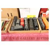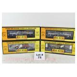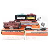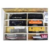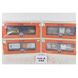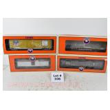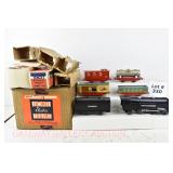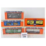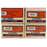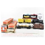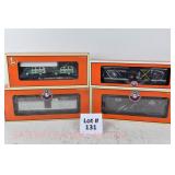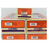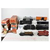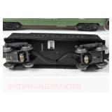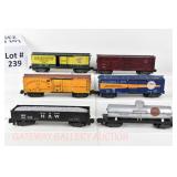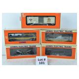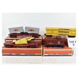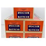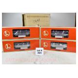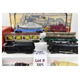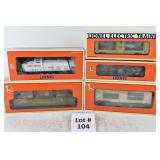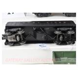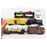 342 Postwar Lionel O Gauge: 6414 Automobile Car, 6025 Gulf Tanker, 6656 Stock Car, 6457 Caboose OB, 3451 Automatic Lumber Car (1 Stake Missing) Tattered Box
