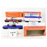 6 Postwar Lionel O Gauge: 3665 Minuteman Missile Launching Car/Missile, 6819 Flat/Helicopter (Tail Broken But There), 3419 Operating Helicopter Car OB (Couple Flaps Missing)
