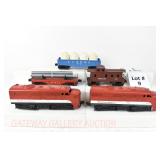 9 Postwar Lionel O Gauge: 210 AA Alco Texas Special Diesels, 6112 Gon/Canisters, 6121 Red Pipe Flatcar, 6017 Caboose No Boxes
