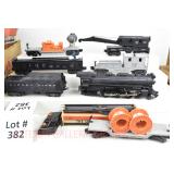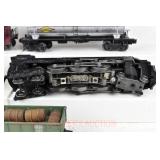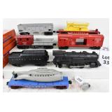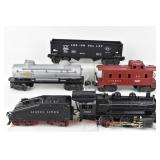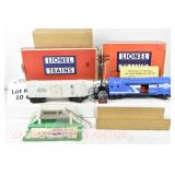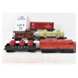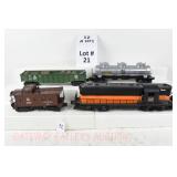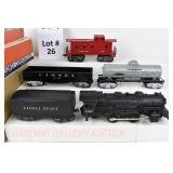 21 Postwar Lionel O Gauge: 2338 Milwaukee Road GP-7 Diesel, 6415 Sunoco Tanker, 6462 Green NYC Gondola/Barrels, 6457 Caboose No Boxes