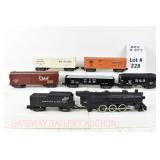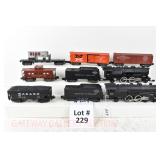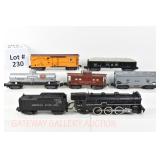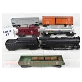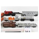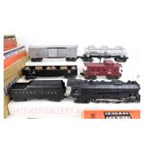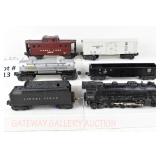 17 Postwar Lionel O Gauge: Lionel Freight: 2065/2046W Loco/Tender ( 1 Tender Step Broken Off, Screwhole Crack), 6456 Gray/Maroon Lettering LV Hopper (Few Paint Chips), 6415 Sunoco Tanker, 6464-25 Great Northern Boxcar, 6462 Green NYC Gon/Barrels, 6357 Caboose No Boxes