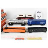 15 Postwar Lionel O Gauge: 6468 B&O Automobile Car, 6430 Trailer Flatcar/Cooper Jarrett Black Labels, 3562-75 Operating Barrel Car/Barrels, 6415 Sunoco Tanker, 6462 NYC Gondola OB