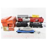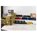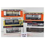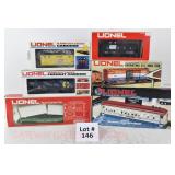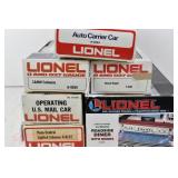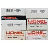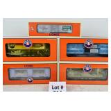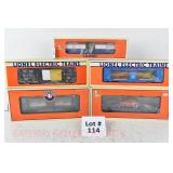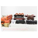 343 Postwar Lionel O Gauge: 6446 N&W Cement Car, 6465 Sunoco Tanker, 3361 Operating Lumber Car/Logs/Tray, 6457 Caboose, 6520 Searchlight Car, 6560 Crane OB (Some Flaps Missing, Crane Is Repro Box)