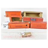 18 Postwar Lionel O Gauge: 2018/1130T Loco/Tender (1 Front Step Bent) OB (No Punchout In Loco Box), 6062 NYC Gon/Cable Reels, 6175 Flat W/Rocket, 6825 Flat/Trestle Bridge, 6017 Caboose Tattered Boxes
