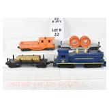 22 Postwar Lionel O Gauge: 624 C&O Switcher, 6561 Cable Reel Flatcar, 3461 Operating Log Car, 6119-25 DL&W Work Caboose No Boxes