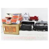 7 Postwar Lionel O Gauge: 2035/6466W Loco/Tender (Cab Bent and Markers Broken Off, Box For Tender Only, Remnant For Loco), 6465 Sunoco Tanker, 3461 Automatic Lumber Car, 6357 Caboose OB: 3464 SF Operating Boxcar, 6462 NYC Gon, 6456 LV Black Hopper All W/Tattered Boxes
