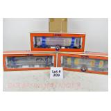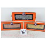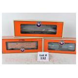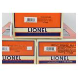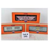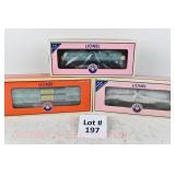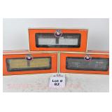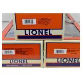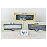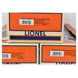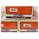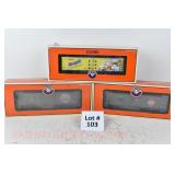 85 Modern Lionel O Gauge: (3) Postwar Celebration Series: 29828 #3666 Cannon Firing Boxcar, 26876 #6544 Missile Firing Trail Car, 29827 #3419 Helicopter Launch Car OB