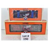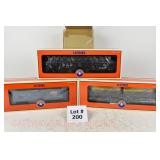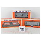 355 Modern Lionel O Gauge: 39429 Bethlehem Steel Hot Metal Car/Flickering Load/Rotating Drum, 39428 Bethlehem Steel Slag Car W/Flickering Slag Load/Rotating Bucket, 36547 Lighted Bethlehem Steel Transfer Caboose OB