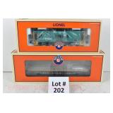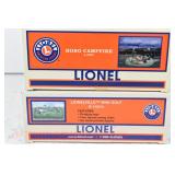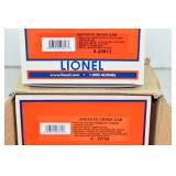353 Modern Lionel O Gauge: 29832 Chessie Crane Car W/Die-Cast Construction, For Use With TMCC, Headlights, Individual Control Of Crane Action, 29833 Chessie Boom Car W/Crane Sounds And Crew Dialog, Wood Deck Factory New In Mailing Cartons