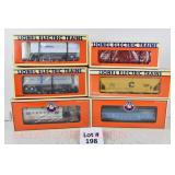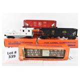 339 Postwar Lionel O Gauge: 6636 Alaska Hopper OB, 6736 Detroit & Mackinac Mac Hopper OB, 6814 First Aid Medical Car (No Accessories) OB, 3434 Operating Chicken Car (No Sweeper) Tattered Box
