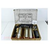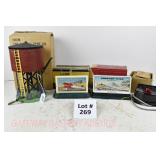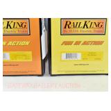 71 Rail King O Gauge: 30-7932 PRR American Crane, 7940 NASA Flatcar/Operating Helicopter, 50009 Greyhound Die-Cast Bus OB