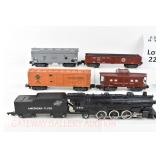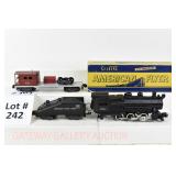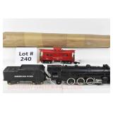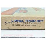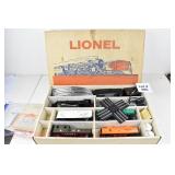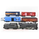 386 Postwar Lionel O Gauge: #19361 Steam Freight Set: 239/1130 Loco/Tender, 6142 Gondola/Canisters, 6465 L/L Tanker, 6014 Frisco Boxcar, 6119-125 Olive Drab Rescue Unit Caboose, Track, Transformer, Instructions Etc. In Set Box