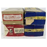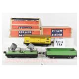 332 Prewar Lionel O Gauge: 814 Automobile Boxcar (1 Coupler Missing), 812 Green Gondola, 820 Searchlight (Small Chip In 1 Lens) Box Remnants