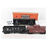 335 Postwar Lionel O Gauge: 6464-225 Southern Pacific Boxcar OB, 3456 N&W Operating Hopper, 6427-3 Lionel Lines Caboose No Boxes