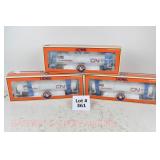 47 MTH O Gauge: (3) Tank Cars: 20-96048 Sunoco Yellow/Orange, 90001e Reading Diesel Fuel, 96026 Jersey Central Chlorine; 98161 B&O Flatcar/Greyhound Baltimore Die Cast Bus OB