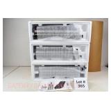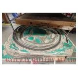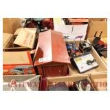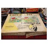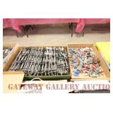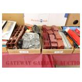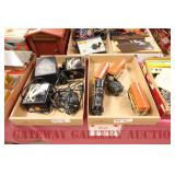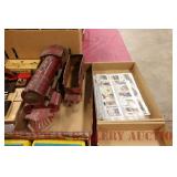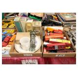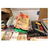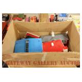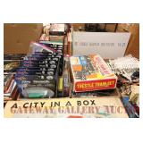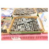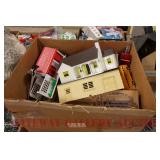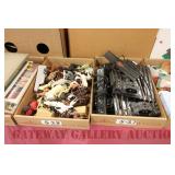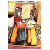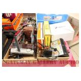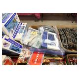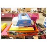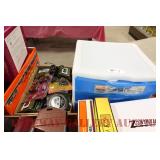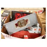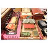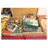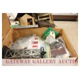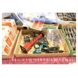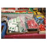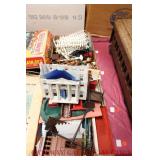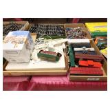 UNCATALOGED: Tray Lots: K-Line Bldgs, S Gauge Track, Matchbox and other Vehicles, Dept 57 Trolley and other accessories, various make transformers, O Gauge coal loads, Plasticville buildings and parts, animals and figures, tunnels, many items for Christmas underground, store display train layout boards
