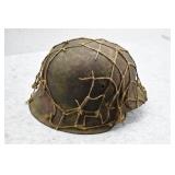 718. German Nazi M-43 Helmet – w/3-Color Camouflage – w/Exposed Army Decal – Half Chicken Wire Covering – Issued to “Busch” – w/Liner and Chin Strap