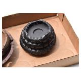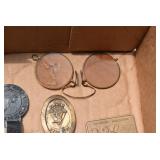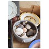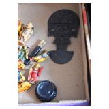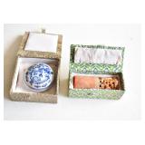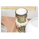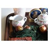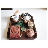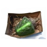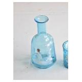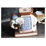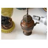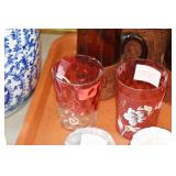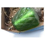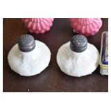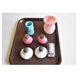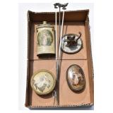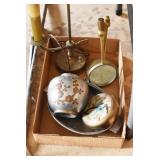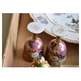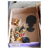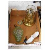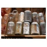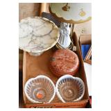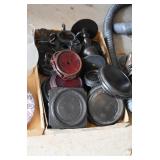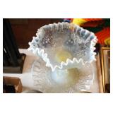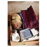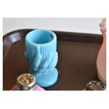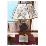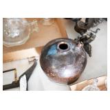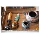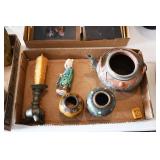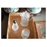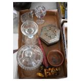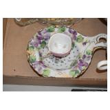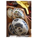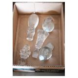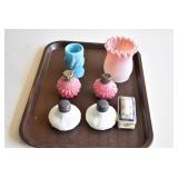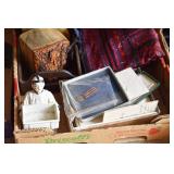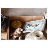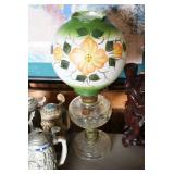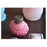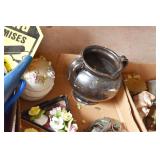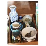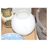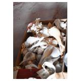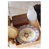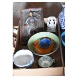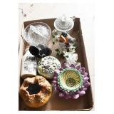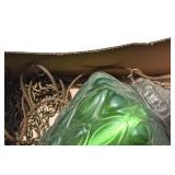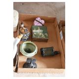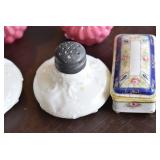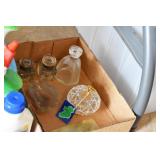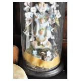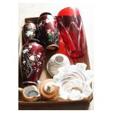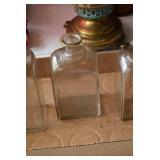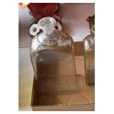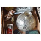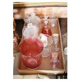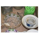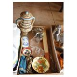Antique Glassware: Kobalt Blue Glass, Ruby Glass, Patterned Glass, Royal Doulton Figurines, Lefton Figurines, Pair of Signed Glass Candle Holders, Bisque Boy/Girl Figurines in Domes, Old Bottles, Glass Baby Bottle, Dishware Sets, Glass Paper Weight, Oriental Pattern China, Miniature Oil Lamps, Glass Trinkets, Carnival Glass, Glass Oriental Figures, Glass Shoes, and Other